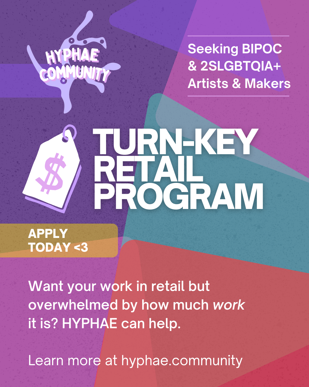 HYPHAE supports a vibrant maker community of 2SLGBTQIA+ and BIPOC creatives in Western Massachusetts, building connections between economic stability and more positive outcomes in interconnected economic and health disparities. We curate retail and market opportunities, identity-based support, and experiences to foster a visible sense of belonging within the wider community.